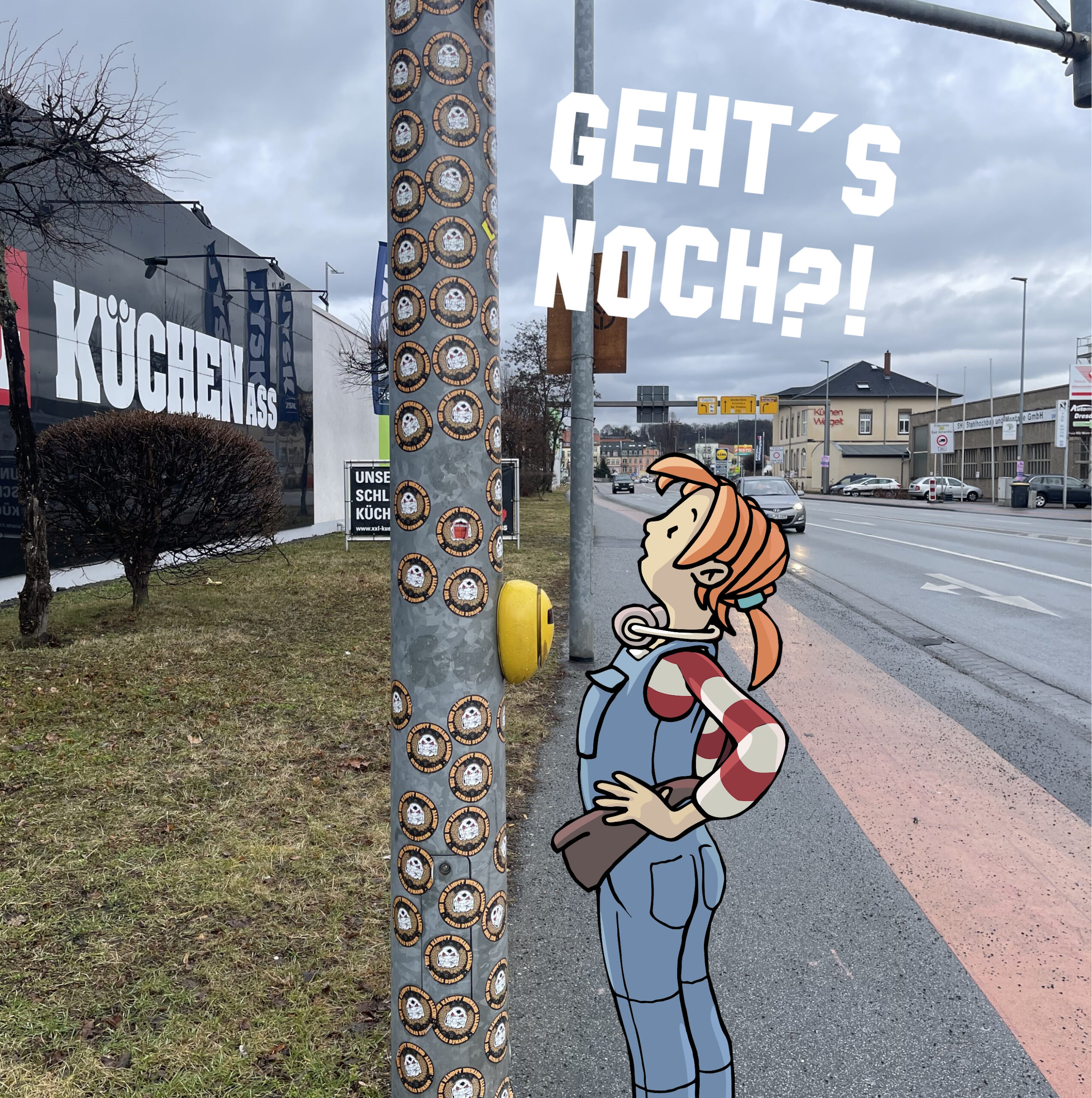 Wisst ihr, was ich in Pirna echt ätzend finde: Kippen in der Murmelbahn, Taschentücher am Elbufer, Dönerpapier und Bierflaschengedöns im Park… eben dieses ganze Zeug, was einem beim Spielen dauernd vor die Füße kullert und am Hacken klebt! Und hey, Pirna ist voll cool und so… auch ohne die ganzen Sticker!