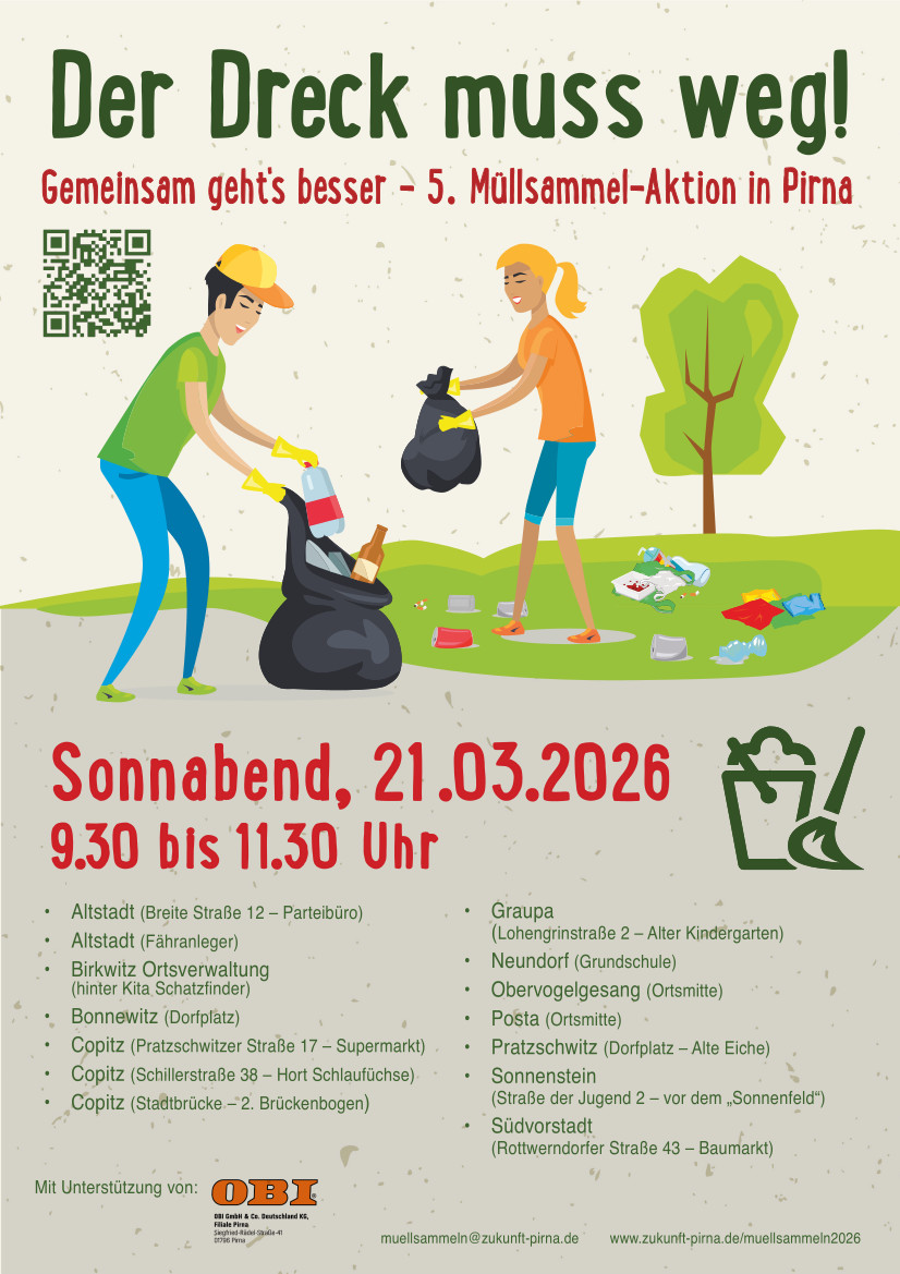Klingt gut? Macht mit! Am 21. März, 9:30 bis 11:30 Uhr, beim 5. Pirnaer Frühjahrsputz! Da treffen sich Müllsammel-Gruppen aus der ganzen Stadt unter dem Motto „Der Dreck muss weg! Gemeinsam geht es besser“. Und denen geht´s nicht bloß um den Müll, sondern auch um Rohstoffrecycling, sagt Burkhard Huth vom Orga-Team. Find ich gut! Eiswaffeln zum Beispiel sind sowieso viel zu schade zum Wegwerfen! Bei der Aktion dabei ist auch der neue Freundeskreis „Pick it up Pirna“. Sophie Sommer und ihre Leute wollen künftig sogar jeden Monat in Pirna aufräumen. Und ich… naja… kann sowas vor allem super gut rumposaunen!