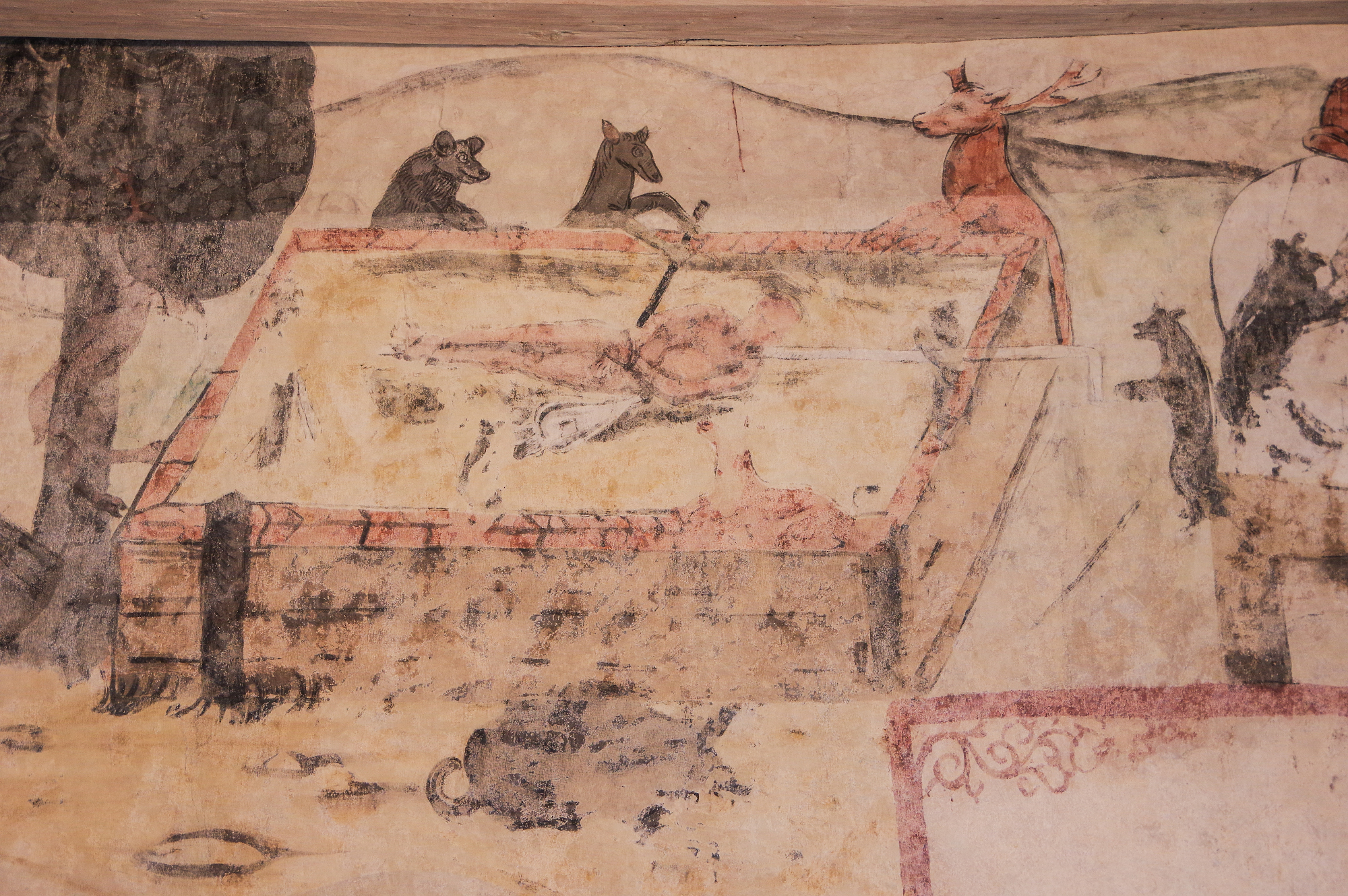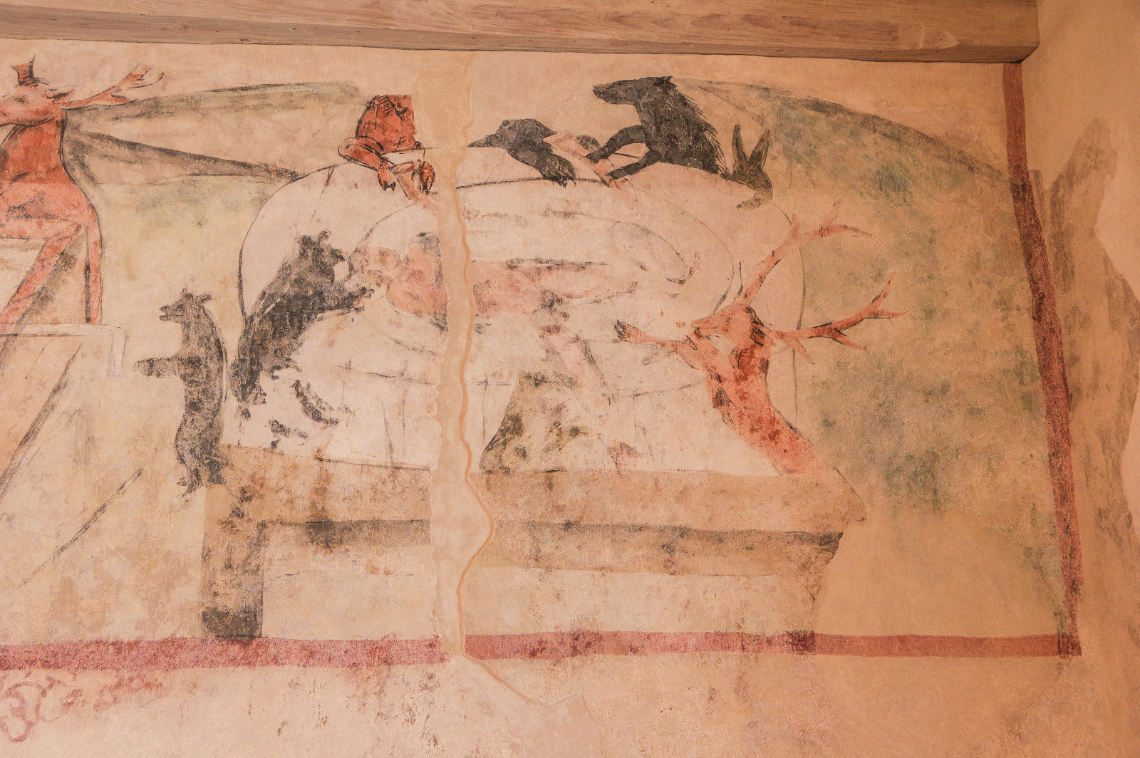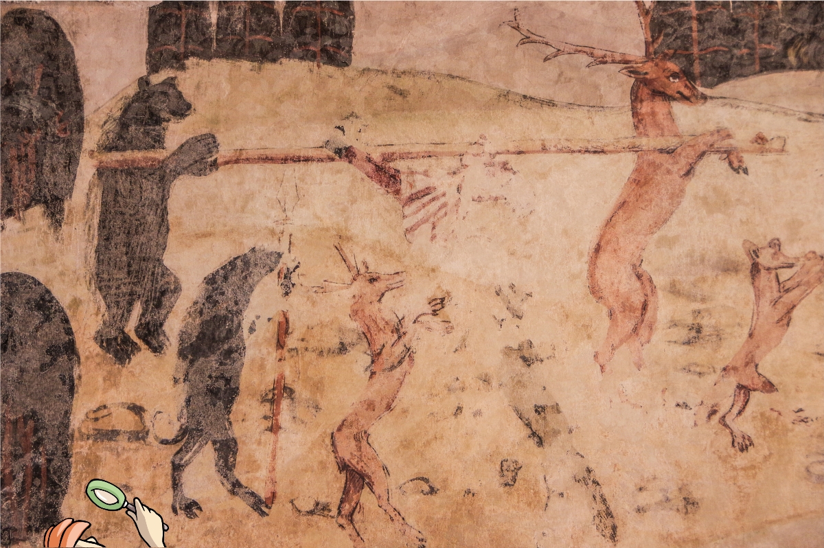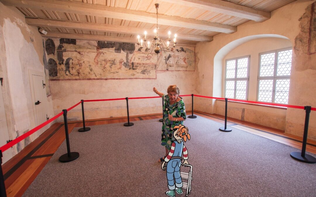 Die Hauseigentümer haben das Bild da vor paar Jahren nur so zufällig beim Sanieren gefunden – unter zig Schichten von alter Farbe. Das Marieneck ist nämlich nicht nur irgendein Haus in der Altstadt, sondern eins der berühmtesten in Pirna. Das hat ne ziemlich spannende Vergangenheit. Früher wurde dort Langezeit Bier gebraut… Und irgendein Sachsen-Kurfürst hat da mal Silbergeld hergestellt… Sogar der Franzosen-Kaiser Napoleon hat da übernachtet. Aber das ist alles nix gegen das Wandbild!!! Frau Körtel denkt, dass die verkehrte Jagd kein Jux war, sondern eher so ne Art Protest. Der Maler wollte damit vielleicht den Reichen drohen… so in der Art: Hört auf, euch andauernd mehr einzusacken, als ihr braucht, sonst verbünden sich irgendwann sogar die Tiere gegen euch – und das wird nicht witzig!